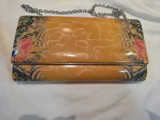 Elegante bolso de mano con un llamativo estampado de serpiente. - Diseño con solapa. - Cadena metálica para llevar al hombro o cruzado. - Acabado en piel sintética. Como nuevo. 20 x 14 x 6 cm
