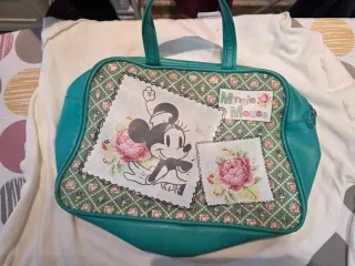 Neceser con diseño de Minnie Mouse. - Estampado floral verde. - Ribetes y asas en color turquesa. - Detalle de Minnie Mouse y flores.