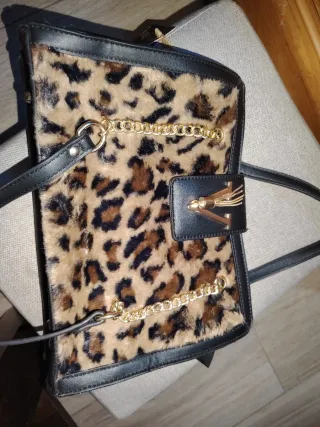 Bolso con estampado de leopardo y detalles en negro. - Material exterior de pelo sintético. - Asa de mano y correa ajustable. - Adorno metálico en la parte frontal.
