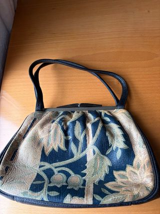 Elegante bolso de cuero con un diseño floral único. Sus asas negras le dan un toque clásico. - Material: Cuero. - Diseño: Estampado floral. - Color: Beige y azul.