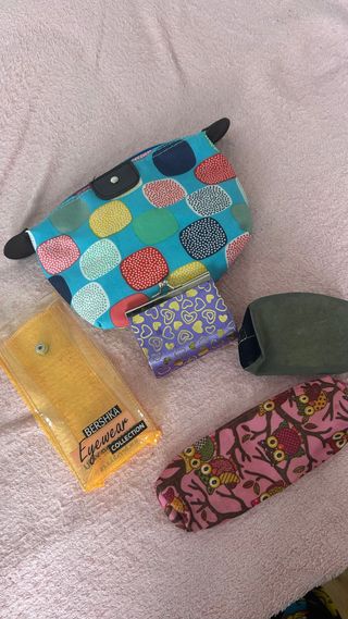 Conjunto de varios neceseres y monederos. - Neceser grande con estampado de círculos. - Monedero morado con corazones dorados. - Funda transparente para gafas. - Funda para gafas con estampado de búhos.