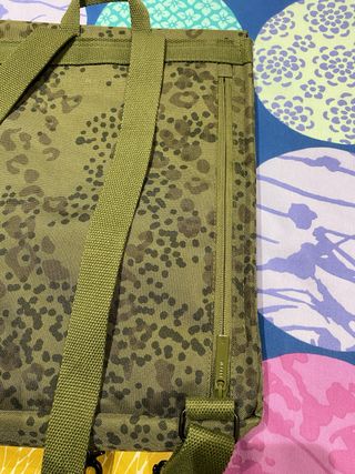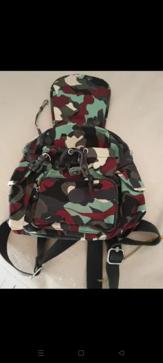 Mochila con estampado de camuflaje en tonos caqui y marrón. Como nueva - Etiqueta de la marca en la parte frontal.
