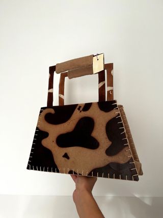 Bolso de mano con un diseño único y llamativo animal print. - Estampado de manchas en tonos beige y marrón. - Costuras visibles en contraste. - Asas superiores. - Cierre de solapa. - Nuevo, a estrenar.