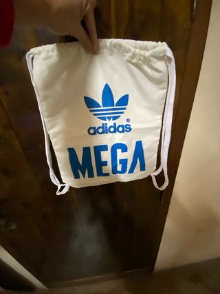 Mochila deportiva Adidas con un diseño llamativo. - Color blanco con detalles en azul. - Logo de Adidas y la palabra MEGA estampados. - Cierre de cordón ajustable.