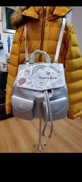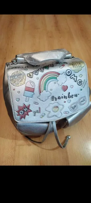 Mochila Bolso plateado con un divertido diseño de arcoíris y nubes. Se puede llevar de bolso con y sin solapa de mochila etc - Estampado de arcoíris, nubes y otros elementos. - Cierre de cordón. - Dos bolsillos frontales Más otros interiores