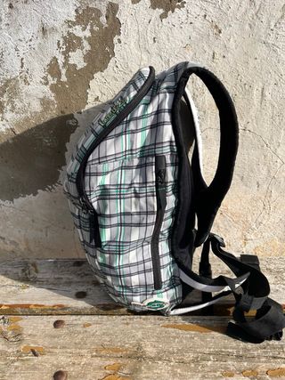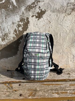 Mochila con un diseño de cuadros llamativo. - Estampado de cuadros en tonos grises y verdes. - Cierre de cremallera frontal. tiene uso se ve en las fotos alguna de las marcas