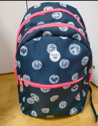 Mochila con un diseño moderno y llamativo. - Estampado de círculos blancos y grises. - Cremalleras de color fucsia. - Logo de Roxy en la parte frontal.