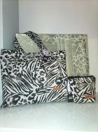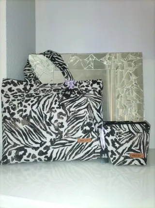 Conjunto de bolso y neceser con un llamativo estampado. - Diseño de animal print. - Incluye bolso grande y neceser a juego. - Hecho a mano