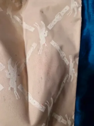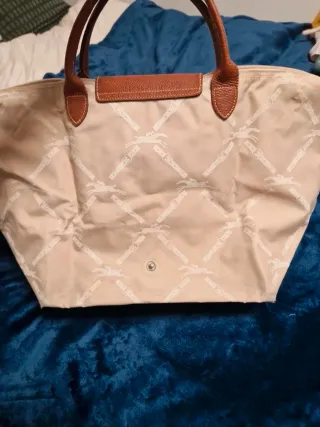 Elegante bolso con un diseño distintivo. - Estampado de caballos blancos sobre fondo beige. - Asas y detalles en piel marrón. Con señales de uso pero aun tiene mucha vida