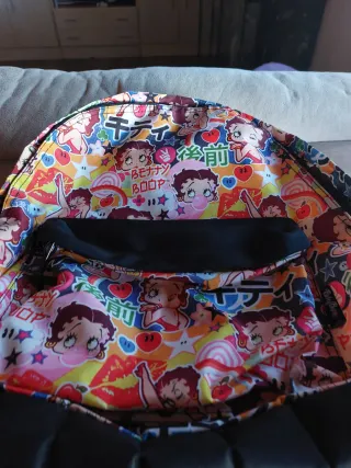 Mochila con un vibrante diseño de Betty Boop. - Estampado multicolor con varios personajes y elementos gráficos. - Compartimento principal con cierre. - Bolsillo frontal adicional con cremallera.