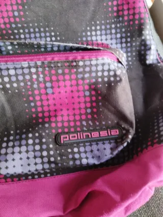 Mochila con un diseño moderno y llamativo. - Estampado de puntos en tonos morados y rosas. - Compartimento frontal con cremallera. - Base inferior en color rosa. - Asa superior y correas ajustables.