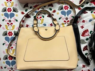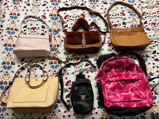 Conjunto de bolsos y una mochila. - Bolso rosa acolchado. - Bolso marrón con solapa de pelo. - Bolso camel de cuero. - Bolso beige grande. - Bolso/riñonera negra. - Mochila rosa con estampado. 5€ cada uno