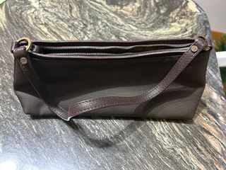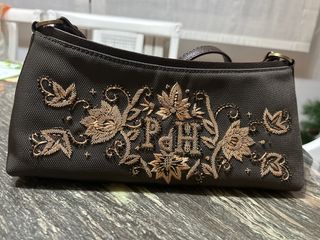 Elegante bolso de mano con el distintivo estampado de la marca. - Diseño con monograma PDH. - Placa metálica dorada con el logo. - Cierre de cremallera. - Ribetes y asa en piel marrón.