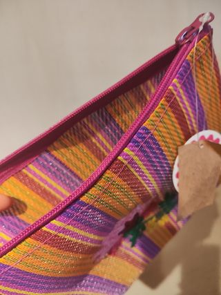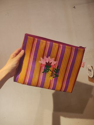 Preciosa bolsa de mano, hecha de plástico reciclado. Es colorida y alegre, perfecta para llevar tus cosas. - Diseño étnico con flores bordadas. - Cierre de cremallera. - Material ligero y resistente. Marca rice by rice