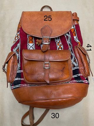 Mochila artesanal de estilo étnico bereber, elaborada en piel. - Diseño con detalles textiles en rojo y blanco. - Compartimento principal con solapa y cierre de hebilla. - Bolsillo frontal con solapa y hebilla. - Bolsillos laterales. - Correas de hombro ajustables.