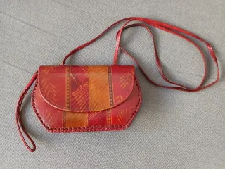 Bolso pequeño de cuero con un diseño étnico y vibrante. - Diseño de rayas verticales en tonos rojos y naranjas. - Adornos con motivos vegetales. - Costuras decorativas en el borde. - Correa larga para llevar al hombro o cruzado. - Medidas: 18.5 x 11 cm