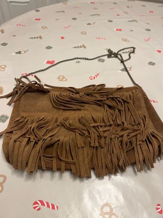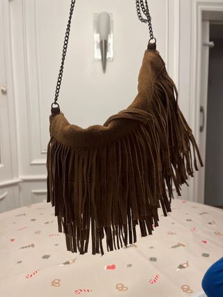 Bolso de estilo étnico con flecos. - Material: ante - Color: marrón - Cadena metálica para colgar