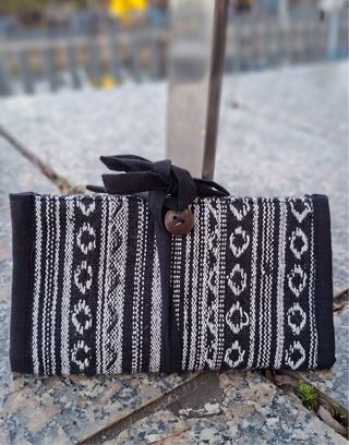 Cartera de tabaco artesanal, confeccionada en Nepal con 100% algodón. Presenta un diseño étnico con detalles en blanco sobre fondo negro. - Cierre con lazo y botón de coco. - Tejido de algodón 100%. -Tamaño 17x9cm cuando está cerrado