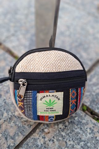 Pequeño monedero circular, ideal para llevar tus esenciales. - Fabricado con una mezcla de cáñamo y algodón. - Diseño étnico con detalles coloridos. - Cierre de cremallera. - Hecho a mano en Nepal. -Tamaño 12cm redondo y caja de 2cm