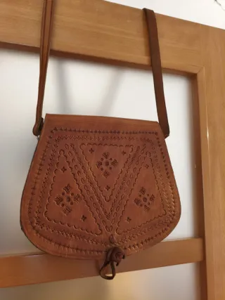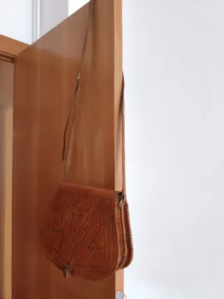 Bolso de cuero artesanal de Marruecos. Con bandolera larga y dos compartimentos en el interior. Usado solo un par de veces. Precio de coste 50€. - Elaborado en piel de alta calidad. - Detalle de bordados y grabados. - Cierre con cordón y asa. - Estilo étnico.