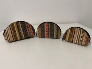 Conjunto de tres monederos hechos a mano en Nepal. Cada uno presenta un diseño único con patrones geométricos y rayas. -3 piezas en un juego - Material: Algodón. - Fabricación artesanal. - Diseño étnico. -Pequeño- 5x9x3cm -Mediano- 7x11x4cm -Grande- 8x13x4.5cm