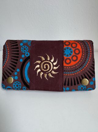 Cartera de dama de 100% algodón, elaborada artesanalmente en Nepal. Presenta un diseño vibrante con un motivo de sol bordado en el centro. - Cierre con broches. - Diseño étnico con detalles circulares y líneas. - Material: 100% algodón. -Tamaño 20x10,5x4cm