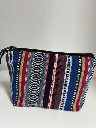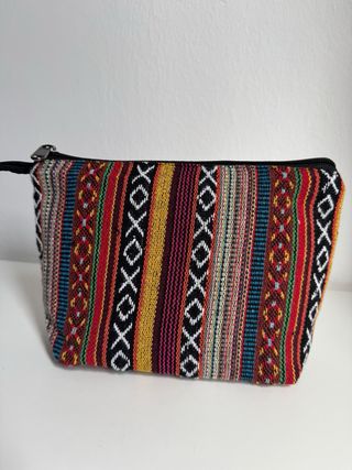Bolso de viaje de tela con un diseño vibrante y étnico, perfecto para organizar tus esenciales. - Fabricado en Nepal. - Material: 100% algodón. -tamaño 16x25x8cm