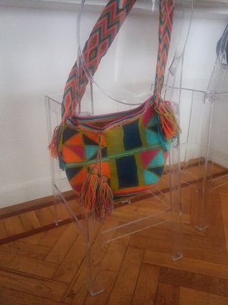Precioso bolso bandolera hecho a mano con bordados multicolor. Ideal para el verano. - Diseño único y colorido. - Cierre de cremallera. - Asa larga ajustable. - borlas decorativas en los costados. La cremallera convendría cambiarla porque aunque funciona a veces le cuesta. Esta usado pero se mantiene bonito.