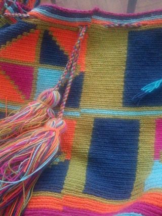 Precioso bolso tejido a mano con detalles étnicos. Es una pieza única, ideal para darle un toque especial a tu look. - Diseño multicolor con flecos. - Elaborado con materiales resistentes. - Asa larga para llevarlo cómodamente al hombro.