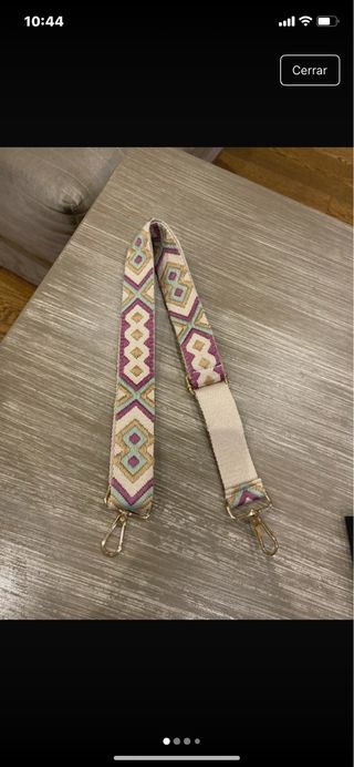 Asa para bolso con un diseño étnico y vibrante. Perfecta para darle un toque personal a tus bolsos. - Diseño geométrico en tonos morados y dorados. - Correa de tela resistente. - Mosquetones dorados para fácil sujeción.