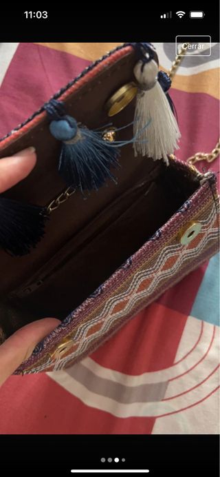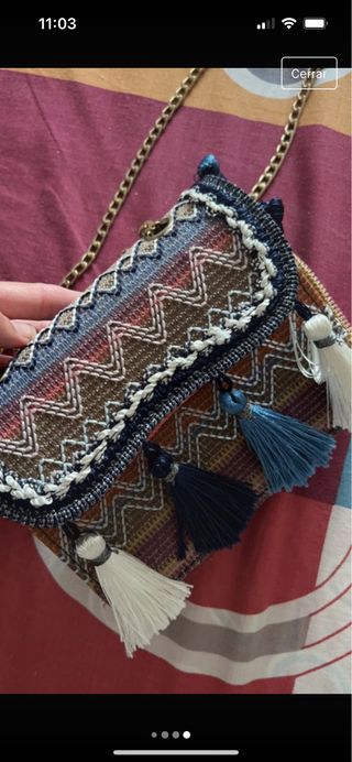 Bolso pequeño de estampado étnico y con borlas. Tiene cadena dorada. Nuevo.