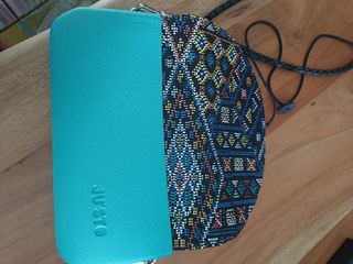 Bolso bandolera de la marca italiana Justo, de color verde turquesa la parte rígida y parte textil étnica. Nuevo.