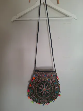 Bolso de estilo étnico con un diseño circular central y adornos. - Bordado detallado. - Flecos de colores vibrantes. - Adornos de pedrería y espejos.