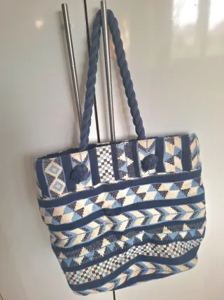 Alegre y original bolso con una terminación impecable. -Exterior confeccionado con tela étnica estampada con combinación de colores azules, granates, amarillos.. - Interior (con forro marrón) tiene bolsito no extraible con cremallera y bolsillos planos realizados con la tela estampada. - Anillas de material plástico efecto desgastado. - Mediadas aprox. Alto, 33 cms Ancho parte superior, 37cms Ancho parte inferior, 29 cms. Profundidad de la base, 8 cms. No se ha usado, en perfectas condiciones.