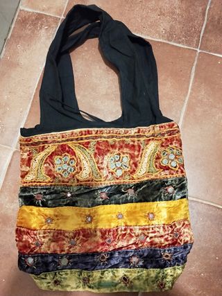 Bolso étnico multicolor hecho en la India . Material, tela. Tiene cremallera en el interior y asa muy larga Negra.