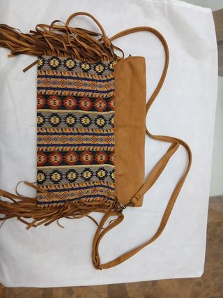 Bolso con un diseño étnico y moderno, perfecto para añadir un toque bohemio a tu estilo. - Adornado con flecos largos en la parte inferior y superior. - Presenta un panel frontal con tejido jaspeado en tonos tierra, azul y rojo. - Incorpora una solapa triangular de ante. - Correa ajustable para llevar al hombro o cruzado.
