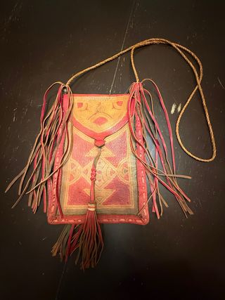 Bolso de piel con un diseño único y detalles artesanales. - Dos aperturas, una delantera y otra trasera. - Adornado con flecos y un llamativo diseño geométrico. - Elaborado en piel de alta calidad.