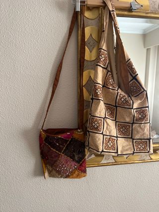 Dos bolsos de tela con un diseño étnico y vibrante. Uno de ellos es un bolso tipo saco con un estampado geométrico en tonos tierra y negro. El otro es un bolso más pequeño, estilo bandolera, confeccionado con retazos de tela en diferentes texturas y adornado con lentejuelas. - Bolso tipo saco con estampado geométrico. - Bolso bandolera de retazos con lentejuelas.