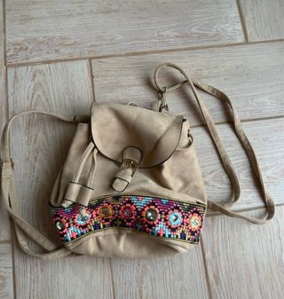 Bolso tipo mochila con un diseño boho y detalles étnicos. - Acabado en ante. - Adorno frontal con bordado multicolor. - Incorpora pequeños espejos decorativos en el bordado. - Cierre de cordón y solapa con hebilla.