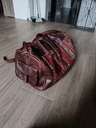 Bolso de piel con un diseño inspirado en Marruecos, combinando cuero y tela con un patrón étnico. - Materiales: Piel y tela. - Diseño: Patrón étnico en tonos rojos y marrones. - Asas: Dobles asas de piel para llevar en mano o al hombro.