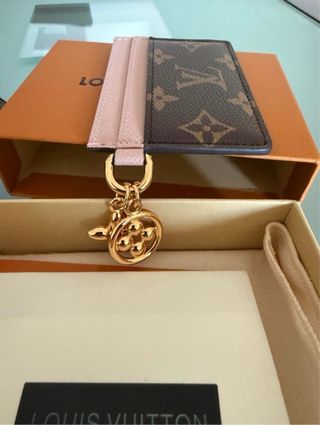 Elegante tarjetero Louis Vuitton femenino con detalles en rosa y marrón. - Diseño icónico de la marca. - Incluye charms dorados. - Compartimentos para tarjetas.