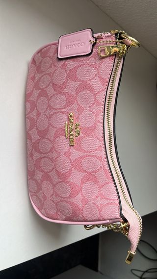 Bolso de Coach en color rosa con el clásico estampado monograma de la marca. Diseño elegante y femenino, ideal para el día a día o para ocasiones especiales. Cuenta con cierre superior de cremallera y herrajes metálicos en tono dorado. Incluye correa extra larga ajustable, lo que permite llevarlo al hombro o cruzado tipo bandolera según preferencia. Se entrega con su bolsa guardapolvo original, perfecta para conservarlo en óptimas condiciones cuando no se utiliza. Un modelo versátil y atemporal que combina fácilmente con cualquier look. 💗