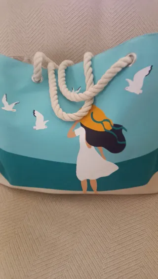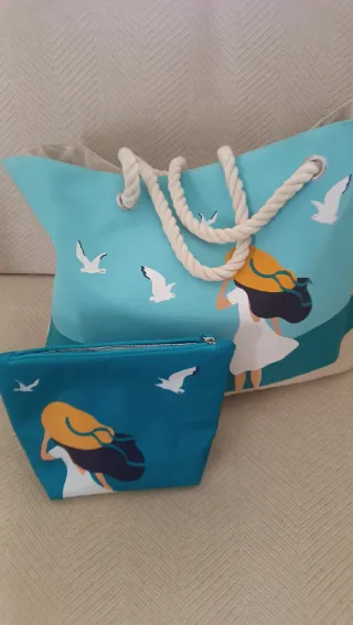 Conjunto de bolsa de playa y neceser a juego con un diseño veraniego. - Bolsa de playa espaciosa. - Neceser térmico a juego con cierre de cremallera. - Estampado de gaviotas y figura femenina.