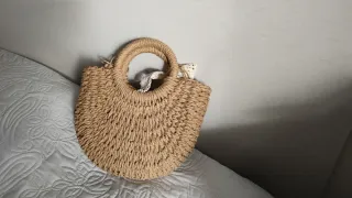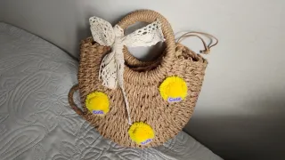 Bolso de rafia perfecto para primavera y verano, con un diseño encantador. - Muy femenino. - Bandolera y de hombro. - Adornado con pompones amarillos. - Detalle de lazo de encaje blanco. - Cierre de cordón. - Caben perfectamente el móvil, el monedero, las llaves...Ver foto para ver tamaño con los objetos. - Aún conserva el papel de relleno en el interior porque nunca lo he usado. -Contesto rápido.