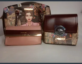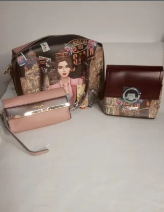 Conjunto de tres bolsos de la marca Nicole Lee Edición limitada temática Spain - Bolso grande con estampado de ciudad y figura femenina. - Bolso pequeño tipo cartera en tono rosa. - Bolso tipo sobre en color burdeos.