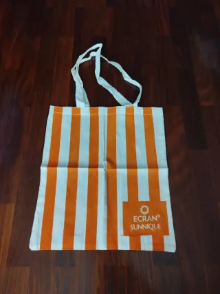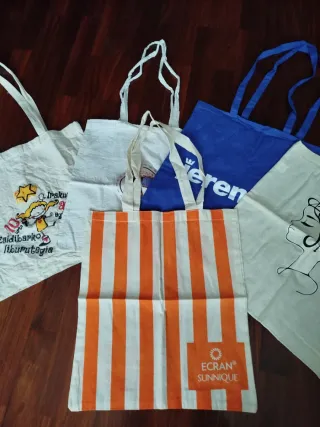 Conjunto de bolsas de tela con dos asas. - Diseño a rayas naranjas y blancas. - Bolsa con estampado de personaje. - Bolsa con diseño de rostro femenino. - Bolsa azul con logo. - Bolsa blanca con texto.