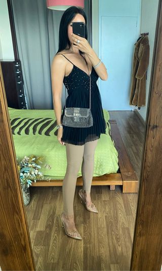 Elegante top negro elástico con un diseño moderno y femenino. - Mangas abullonadas de tul con topitos. - Escote cuadrado. - Corte ajustado. Nuevo, sin uso..!! Noche.fiesta.coctel.navidad.Marca.zara.Stradivarius.bershka.pull&bear.H&M.gafas.botas.zapatillas.monedero.bolso.mochila.camisa.blazer.abrigo.cazadora.pantalon.vaquero.falda.vestido.mono.anillo.collar.pulsera.plata.tous.guess.chaqueta.jersey