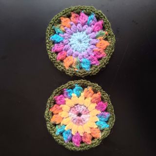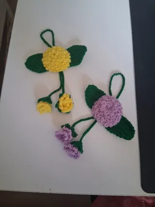 Conjunto de adornos de flores hechos a mano con ganchillo. - Flores amarillas con capullos. - Flores moradas con capullos. - Hojas verdes. Se pueden realizar de varios colores y si son algunas se hace precio. Te oueden tocar tambien si haces un pedido de 10 bolitas, lo puedes ver en tiktok en lassorpresasdetaba.