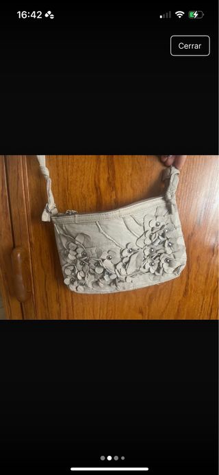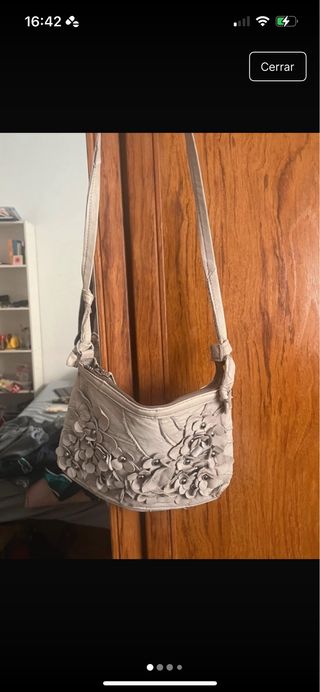 Bolso de mano o bandolera con un diseño floral en relieve. - Casi nueva. - Cierre de cremallera. - Correa ajustable con estampado. - Detalle de flor en relieve.