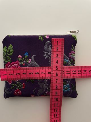 Monedero con un bonito diseño floral bordado. - Base de color morado intenso. - Flores en tonos rosas, azules y verdes. - Detalle de hojas y tallos verdes. - Cierre de cremallera